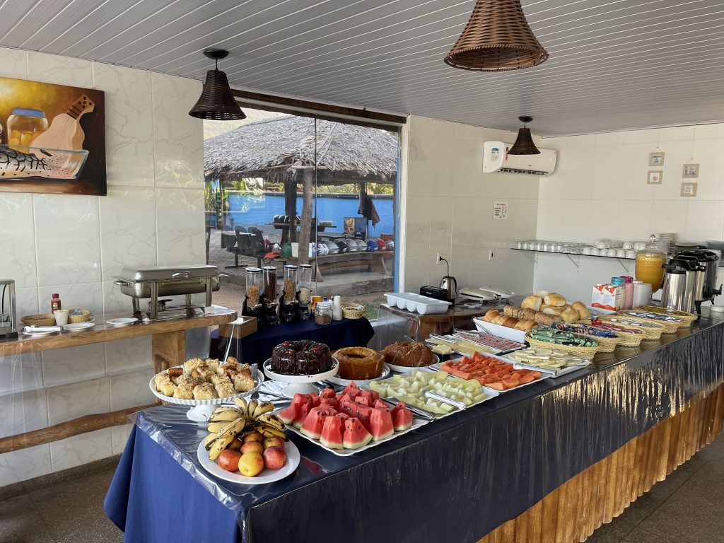 Delicioso café da manhã com sucos, frutas, bolos e muito mais.